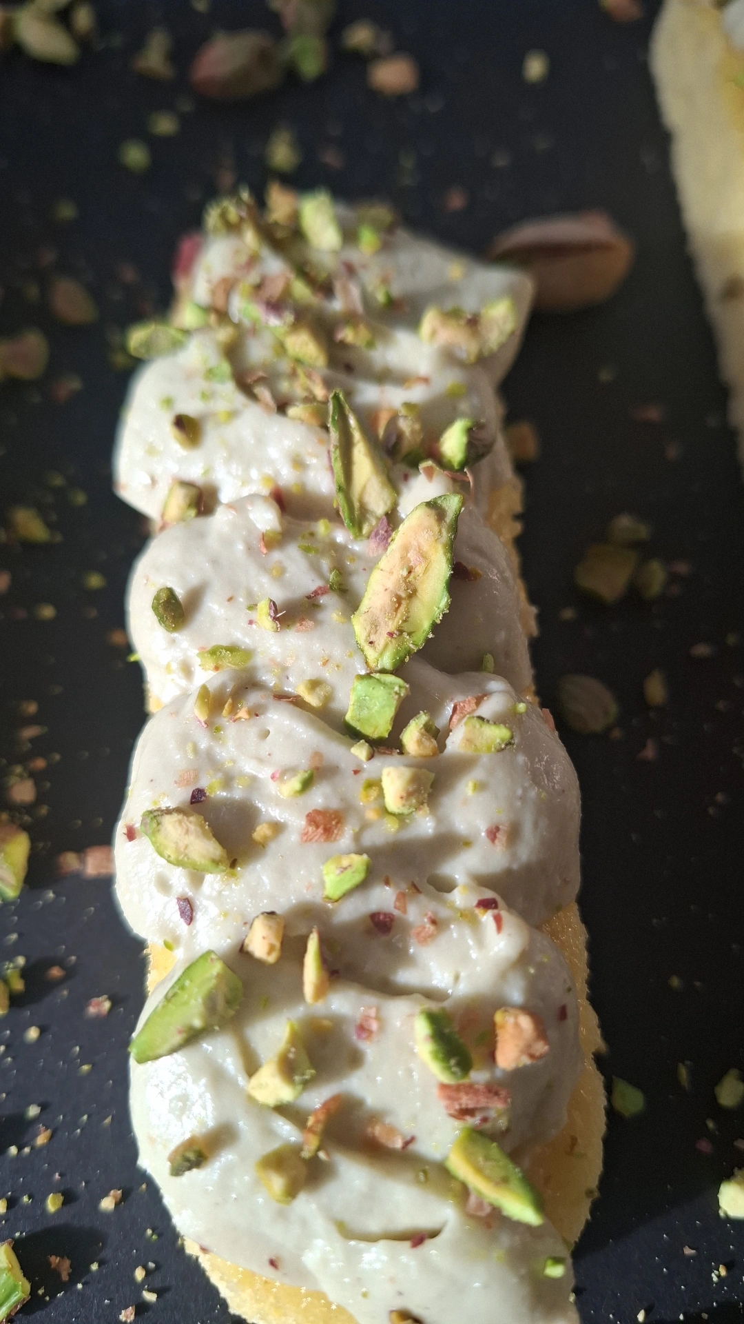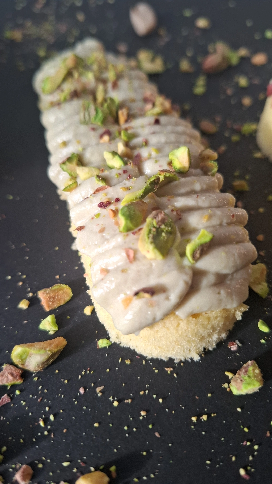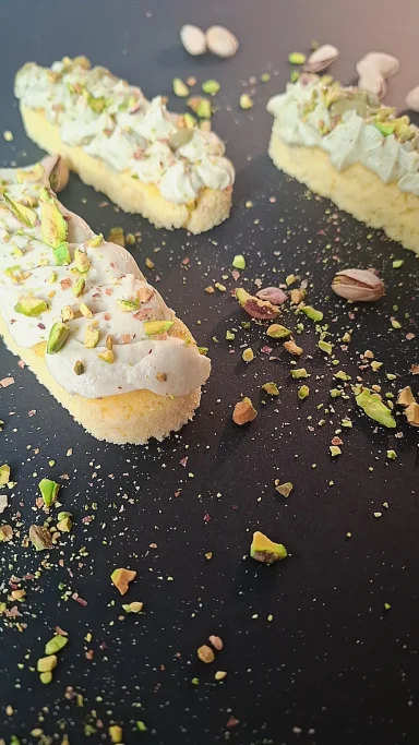 Nežen vanilijev biskvit, polnjen s kremasto pistacijino kremo in posut z drobljenimi pistacijami. Elegantna sladica z bogat
