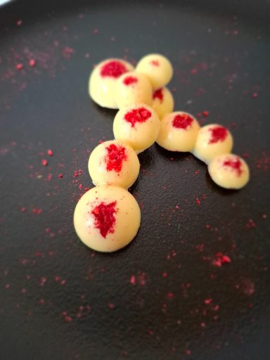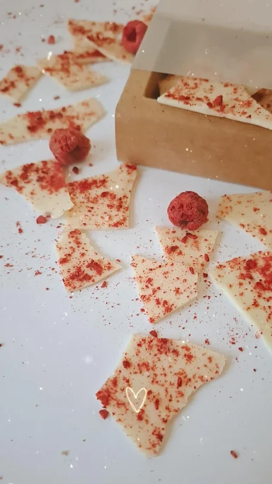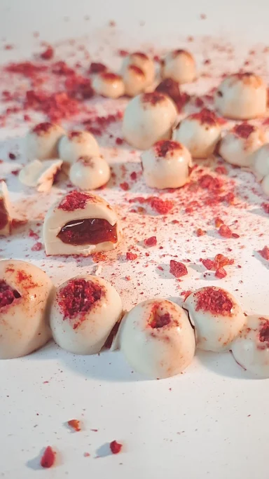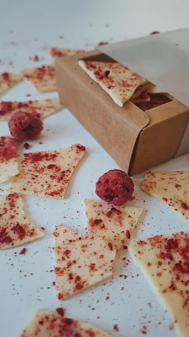 Nežna bela čokoladica s polnilom iz svežega malinovega gela, dopolnjena z liofiliziranimi malinami. Popolno ravnovesje med sladkim in sadnim