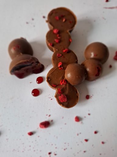 Bogata mlečna čokoladica s sadnim malinovim gelom in liofiliziranimi malinami za dodatno svežino in teksturo