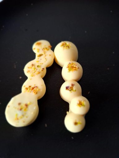 Nežna bela čokoladica s kremastim pistacijinim polnilom in poudarjenim oreškastim okusom. Elegantna sladica z bogato teksturo in prefinjeno