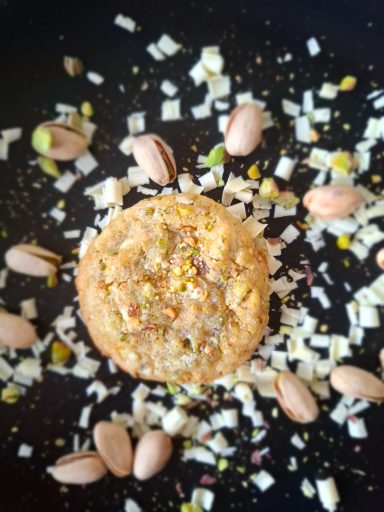 Mehki cookies s kremno pistacija kremo in hrustljavimi koščki pistacije. Bogat oreškast okus in popolna kombinacija mehkega testa in polnila