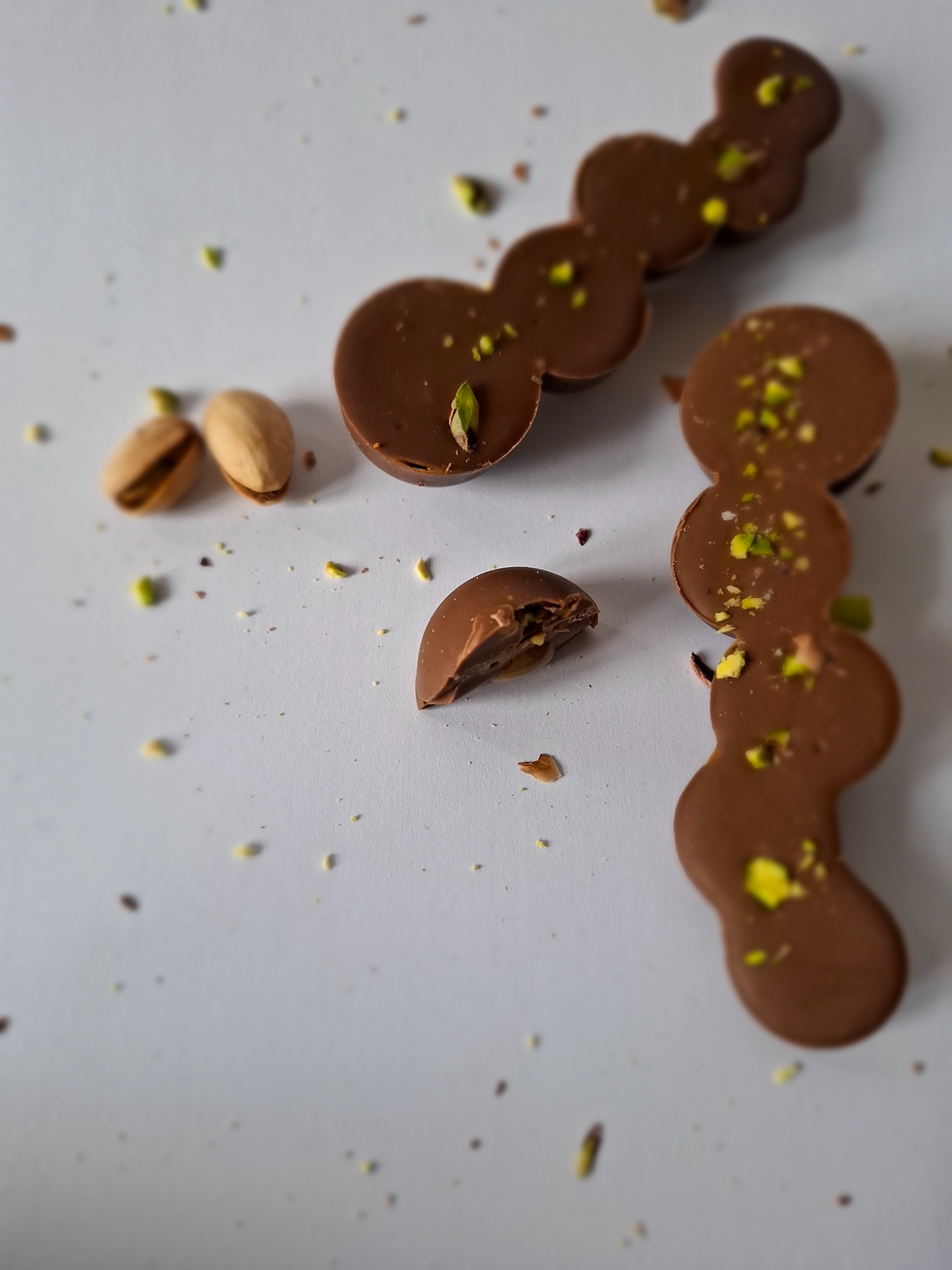 Mlečna čokoladica s pistacijinim gelom, koščki pistacije in drobljenimi pistacijami. Poln, oreškast okus in razkošna tekstura